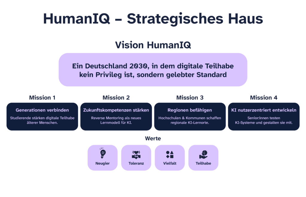 Mit HumanIQ bauen wir das erste flächendeckende Reverse-Mentoring-Netzwerk Deutschlands auf. Bis 2030 wollen wir in allen Regionen präsent sein. Gemeinsam mit Hochschulen, Kommunen und einer KI-Industrie, die Verantwortung trägt.